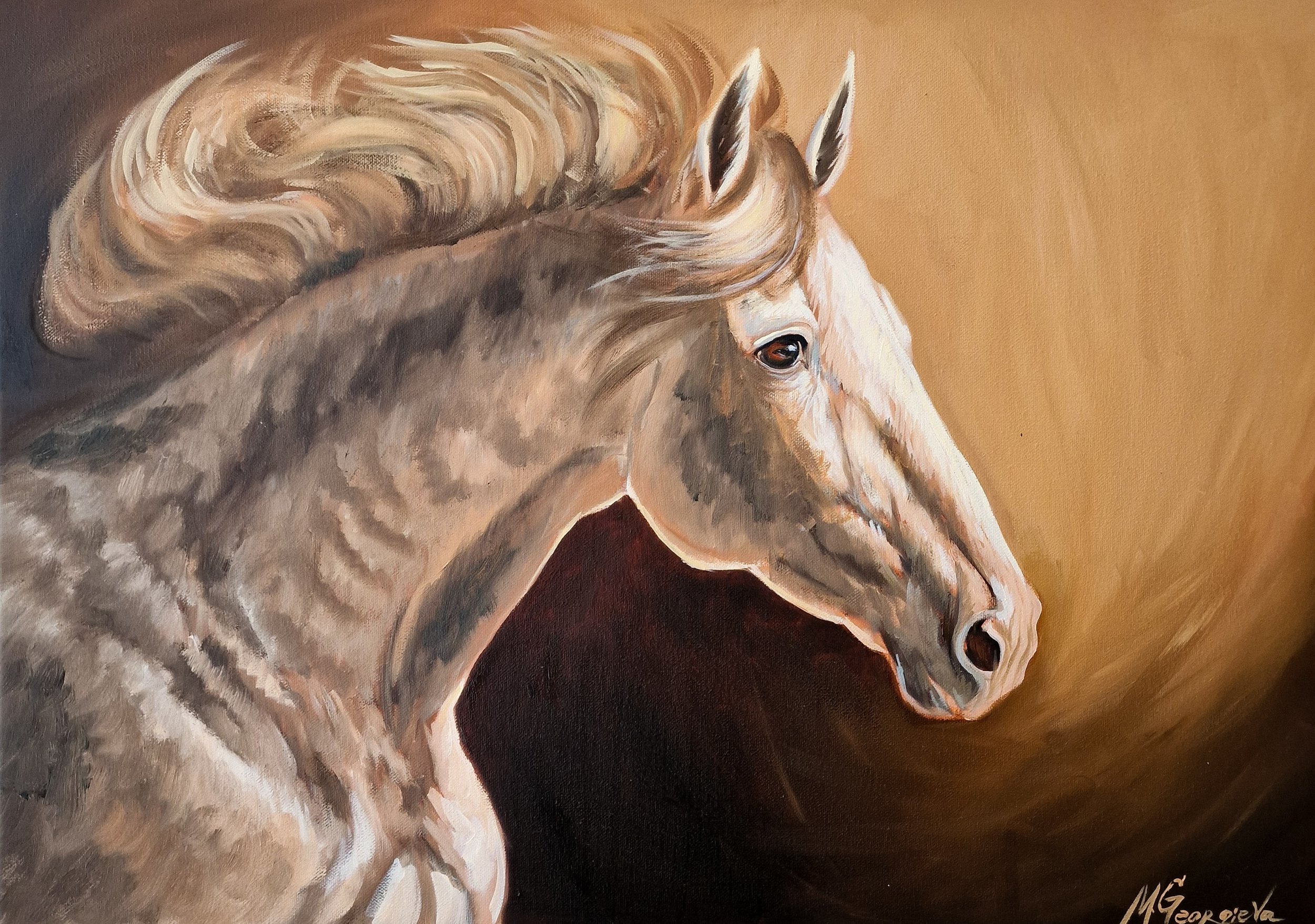 Оригинална, авторска картина с кон, рисувана с маслени бои върху платно с размери 50х70см. Картината е нарисувана в меки, земни цветове, които носят уют и топлина , а фигуралната композиция на коня носи движение и енергия. Комбинация , която внася елегантност и подчертава характера на вашето пространство.